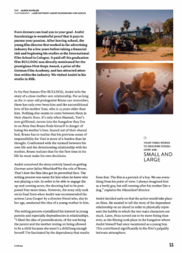 […] BULLDOG porträtiert einfühlsam einen jungen Mann, der erst mit der Zeit erkennt, dass sich etwas verändern muss, dass er sich verändern muss. In einer Szene sagt Toni zu Hannah, wie um es sich selbst zu bestätigen: ‚Wir sind glücklich‘. Dann schaut sie rüber zu ihrem Sohn und fügt leise hinzu: ‚Oder, Bruno?‘ Bruno zögert lange, bevor er nickt. Bruno wird von Julius Nitschkoff verkörpert und man merkt, dass Regisseur und Drehbuchautor André Szardenings seinem Hauptdarsteller die Rolle auf den Leib geschrieben hat.